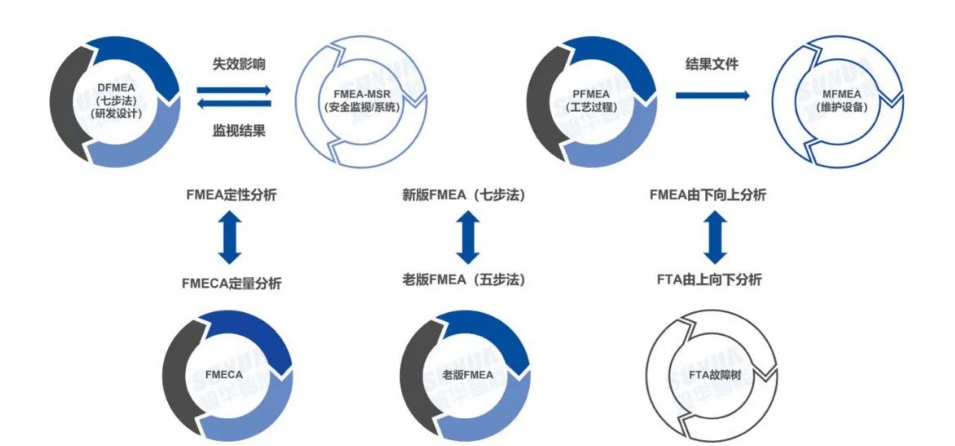 DFMEA以研发设计阶段为主要分析对象;PFMEA以工艺设计阶段为主要分析对象;FMECA以量化分析为主。